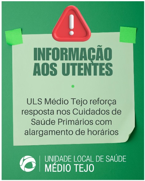 A Unidade Local de Saúde do Médio Tejo (ULS Médio Tejo) vai reforçar a resposta assistencial nos Cuidados de Saúde Primários através do alargamento do horário de funcionamento de três Centros de Saúde da região. Assim, a partir de hoje, quinta-feira, 8 de Janeiro, os Centros de Saúde de Abrantes (Polo de Alferrarede), Tomar (Edifício da Nabância) e Torres Novas (Centro de Saúde) irão prolongar o seu horário até às 22h00, nos dias úteis. (ler mais...)