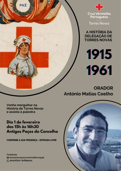 A história da delegação da Cruz Vermelha em Torres Novas é o tema da palestra que se realiza no próximo dia 1 de Fevereiro, domingo, pelas 15 horas, nos antigos Paços do Concelho de Torres Novas (antiga Câmara Municipal).