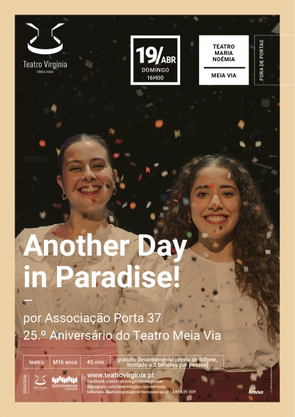 No próximo dia 19 de Abril (domingo), às 16h00, o Teatro Maria Noémia, na Meia Via, recebe o espectáculo “Another Day in Paradise!”, uma criação da Associação Porta 37, integrada nas comemorações do 25.º Aniversário do Teatro Meia Via. Com uma duração de 45 minutos e classificação etária M/16, este espectáculo de teatro propõe uma reflexão crítica e sensível sobre os papéis tradicionalmente atribuídos às mulheres na sociedade contemporânea. (ler mais...)